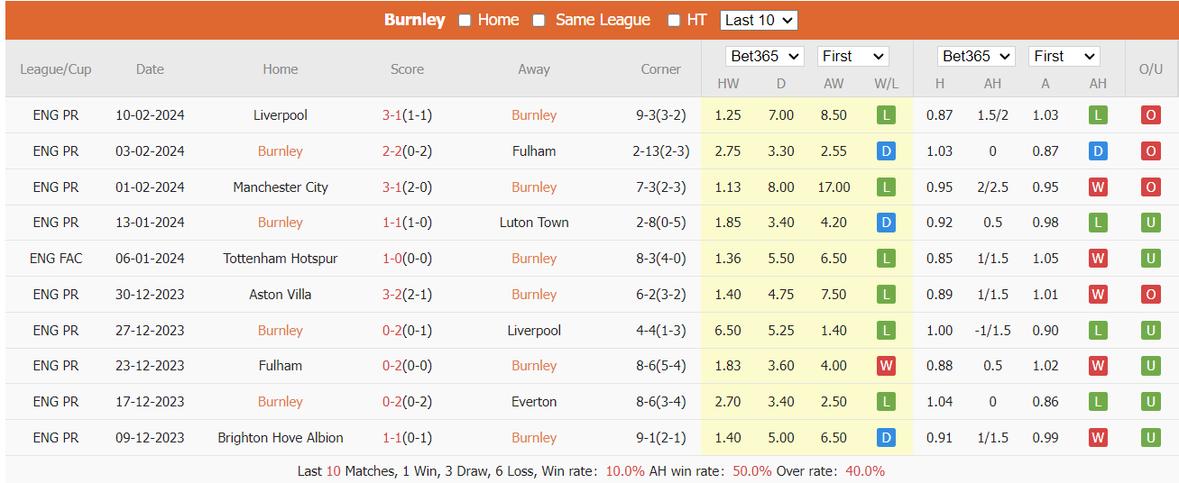 Thống kê kèo châu Á Burnley. 10 trận gần nhất Burnley có tỷ lệ thắng kèo là 50%, tỷ lệ kèo tài là 40%
