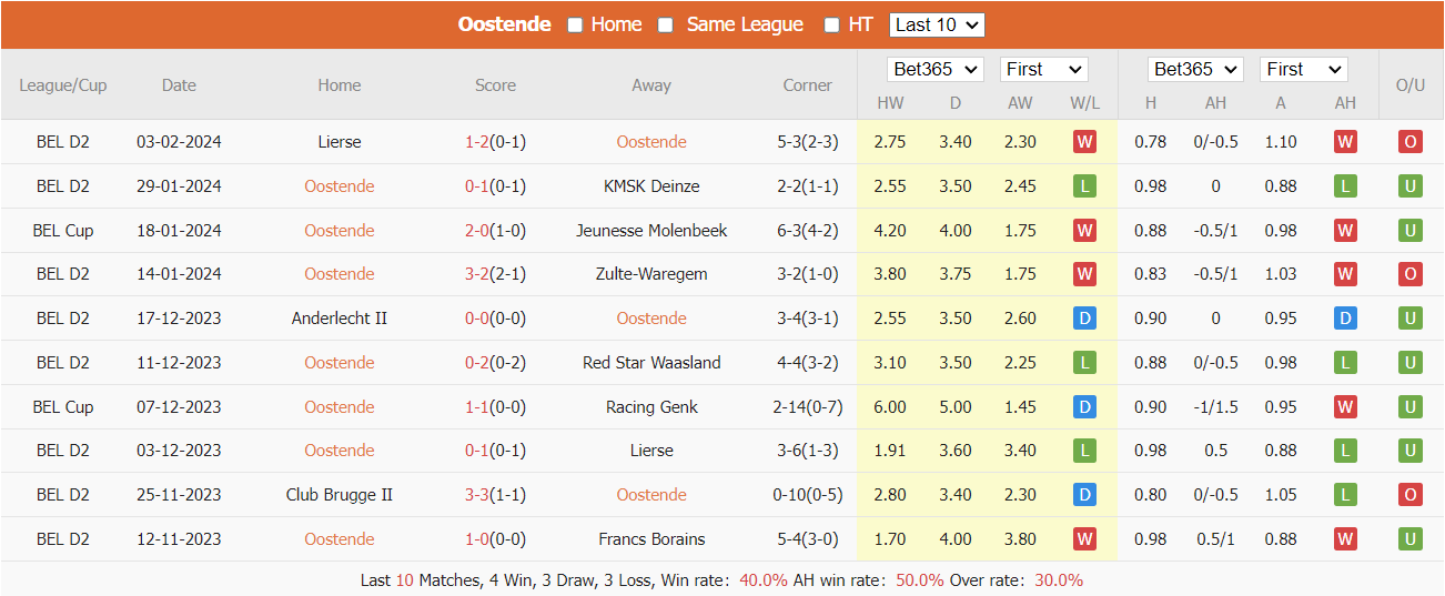 Thống kê kèo châu Á KV Oostende. 10 trận gần nhất KV Oostende có tỷ lệ thắng kèo là 50%, tỷ lệ kèo tài là 30%