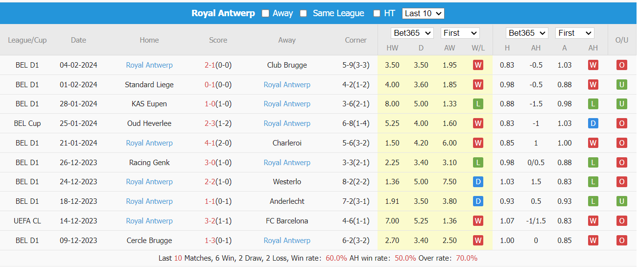 Thống kê kèo châu á Royal Antwerp
