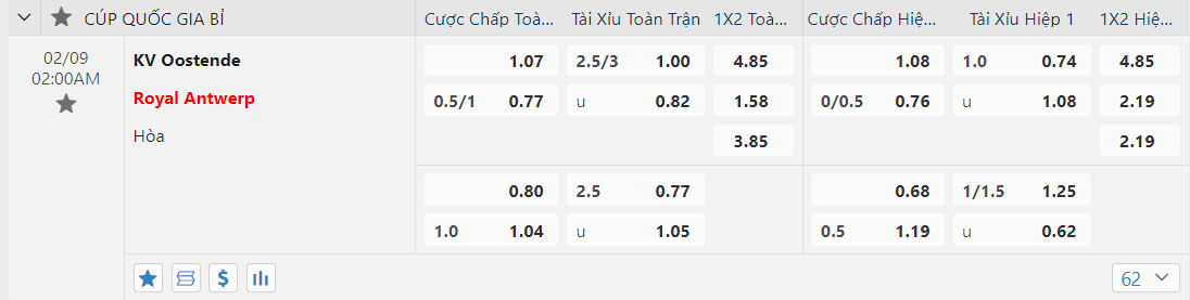 Tỷ lệ kèo giữa KV Oostende vs Royal Antwerp