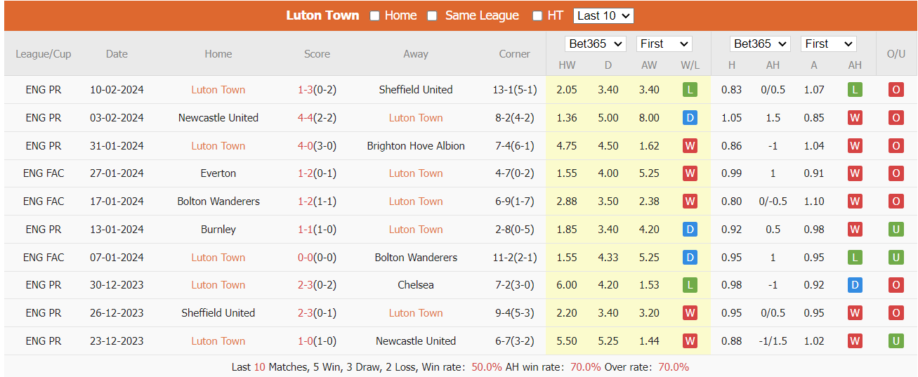 Thống kê kèo châu Á Luton Town. 10 trận gần nhất Luton Town có tỷ lệ thắng kèo là 70%, tỷ lệ kèo tài là 70%