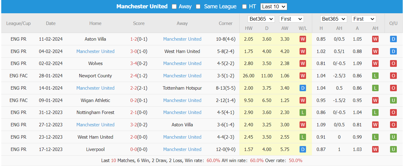 Thống kê kèo châu Á Manchester United. 10 trận gần nhất Manchester United có tỷ lệ thắng kèo là 60%, tỷ lệ kèo tài 50%