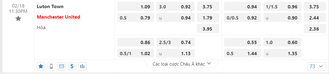 Nhằm thỏa mãn những người xem cũng làm vừa lòng đại đa số các người chơi trong trận đấu giữa Luton Town vs Manchester United lúc 23:30 ngày 18/02/2024, lên các kèo đấu chi tiết phản ánh rõ về bức tranh toàn cảnh màn chạm trán này và những dự đoán mang tính chính xác vẫn được xuất hiện ở cuối mỗi kèo.