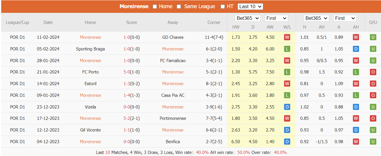 Thống kê kèo châu Á Moreirense. 10 trận gần nhất Moreirense có tỷ lệ thắng kèo là 50%, tỷ lệ kèo tài là 40%