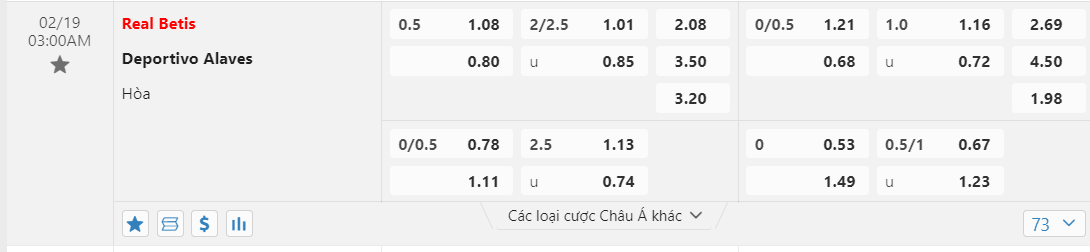 Tỷ lệ kèo giữa Real Betis vs Alaves