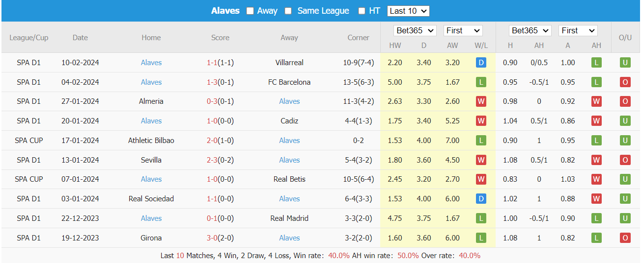 Thống kê kèo châu Á Alaves. 10 trận gần nhất Alaves có tỷ lệ thắng kèo là 50%, tỷ lệ kèo tài 40%
