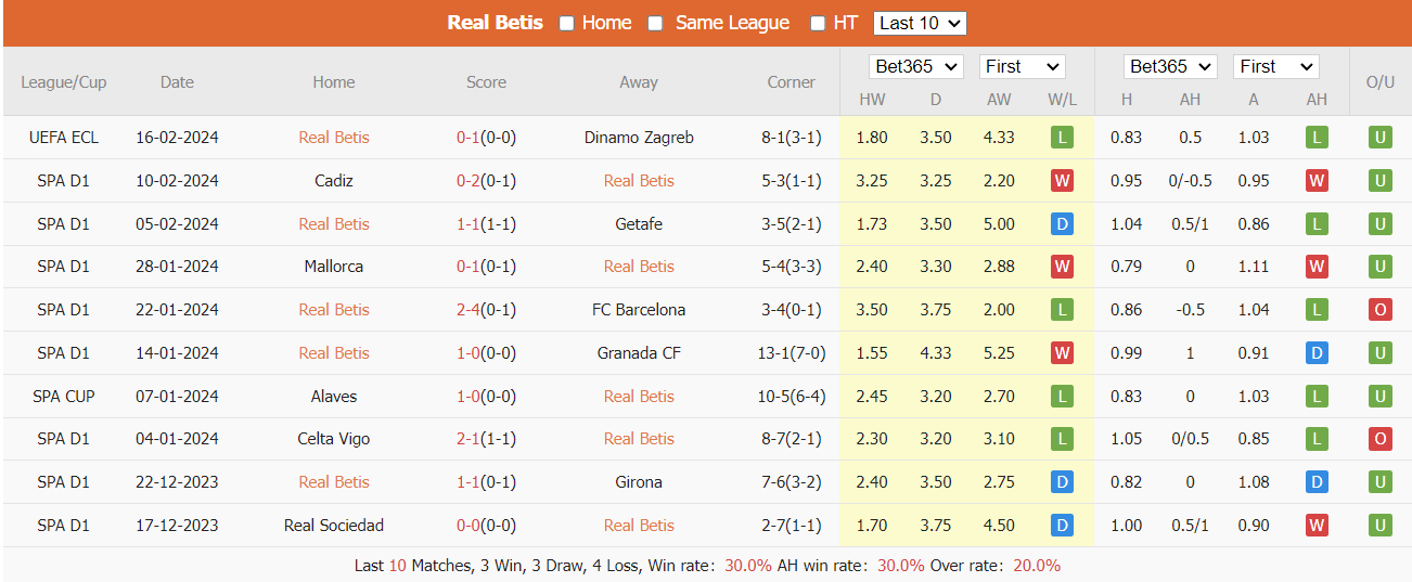Thống kê kèo châu Á Real Betis. 10 trận gần nhất Real Betis có tỷ lệ thắng kèo là 30%, tỷ lệ kèo tài là 20%