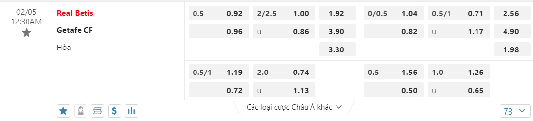 Nhằm thỏa mãn những người xem cũng làm vừa lòng đại đa số các người chơi trong trận đấu giữa Real Betis vs Getafe lúc 00:30 ngày 05/02/2024, lên các kèo đấu chi tiết phản ánh rõ về bức tranh toàn cảnh màn chạm trán này và những dự đoán mang tính chính xác vẫn được xuất hiện ở cuối mỗi kèo.