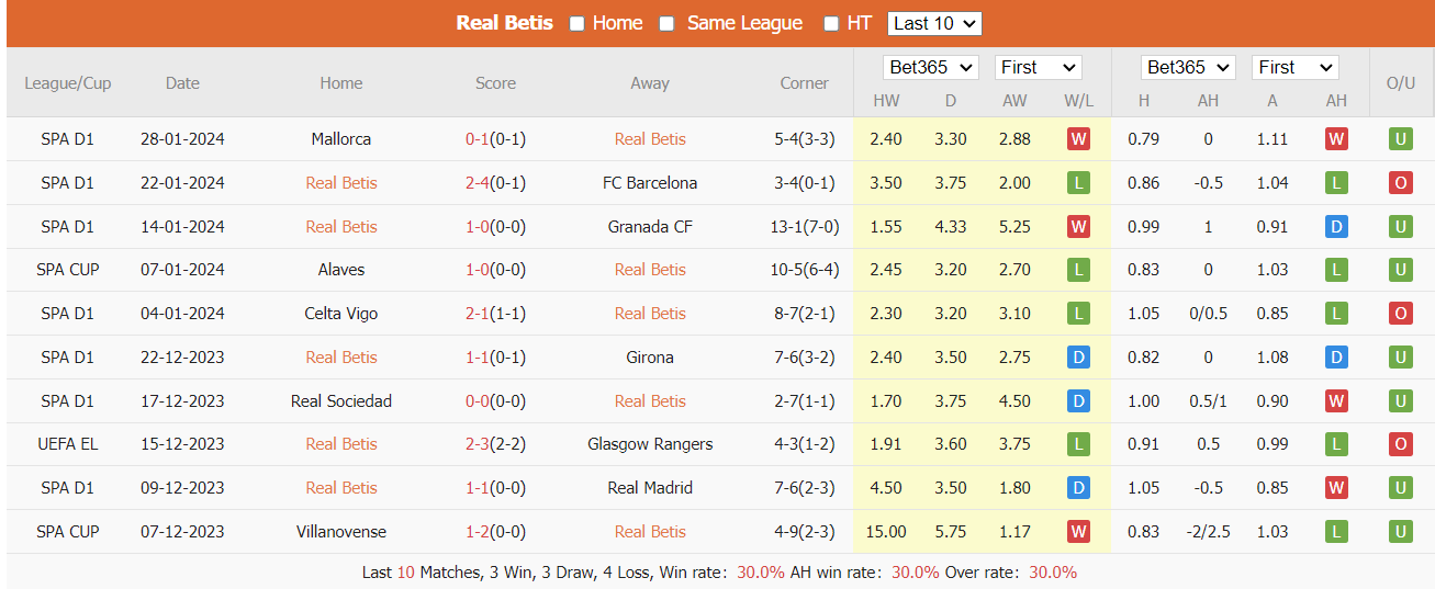 Thống kê kèo châu Á Real Betis. 10 trận gần nhất Real Betis có tỷ lệ thắng kèo là 30%, tỷ lệ kèo tài là 30%