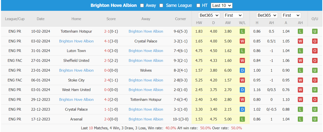 Thống kê kèo châu Á Brighton. 10 trận gần nhất Brighton có tỷ lệ thắng kèo là 45%, tỷ lệ kèo tài 50%