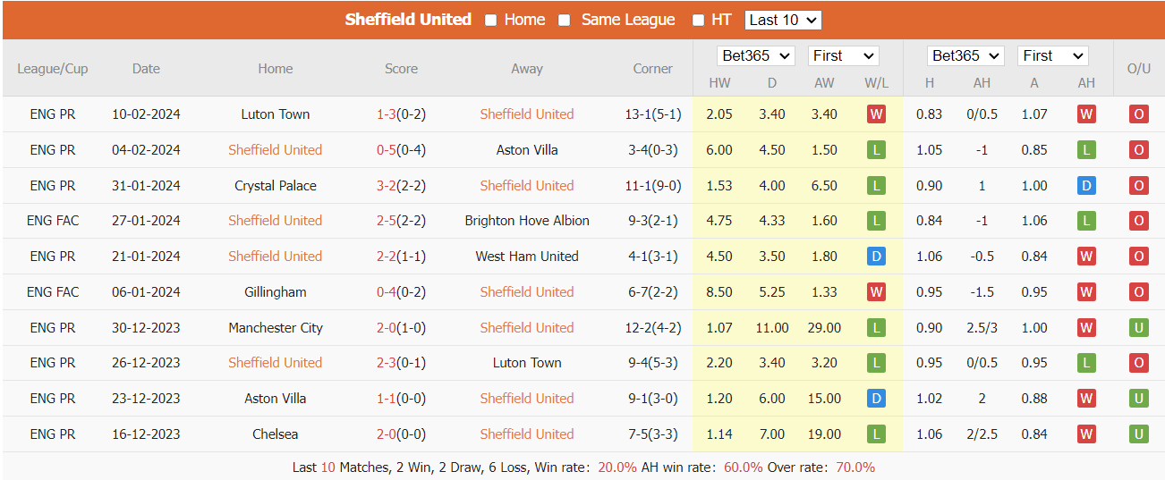 Thống kê kèo châu Á Sheffield United. 10 trận gần nhất Sheffield United có tỷ lệ thắng kèo là 60%, tỷ lệ kèo tài là 70%