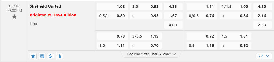 Tỷ lệ kèo giữa Sheffield United vs Brighton