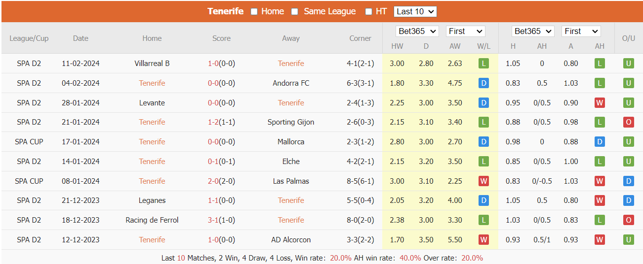Thống kê kèo châu Á Tenerife. 10 trận gần nhất Tenerife có tỷ lệ thắng kèo là 40%, tỷ lệ kèo tài là 20%