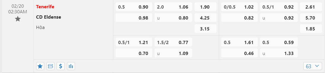 Kèo tài xỉu trong trận đấu giữa Tenerife vs CD Eldense lúc 02:30 ngày 20/02/2024