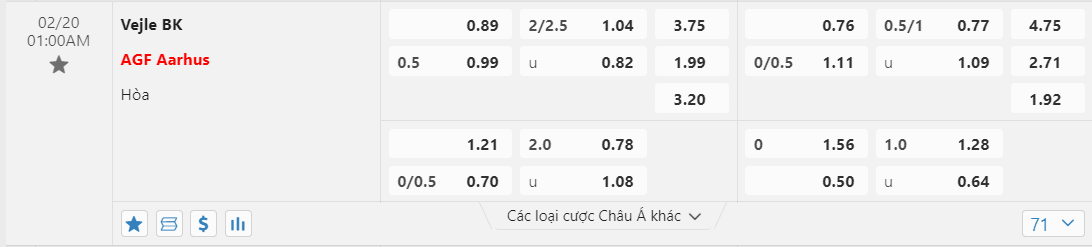 Kèo tài xỉu trong trận đấu giữa Vejle BK vs AGF Aarhus lúc 01:00 ngày 20/02/2024