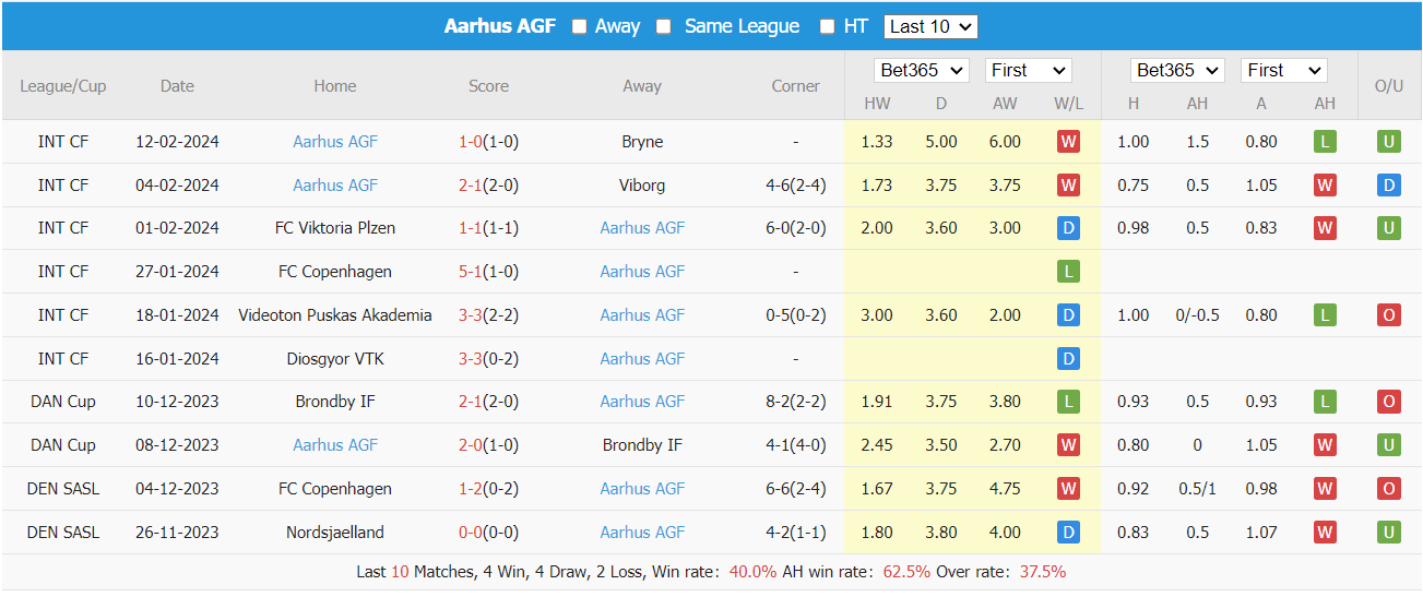 Thống kê kèo châu Á AGF Aarhus. 10 trận gần nhất AGF Aarhus có tỷ lệ thắng kèo là 62.5%, tỷ lệ kèo tài 37.5%