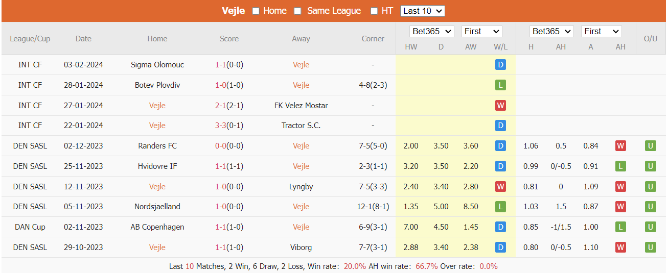 Thống kê kèo châu Á Vejle BK. 10 trận gần nhất Vejle BK có tỷ lệ thắng kèo là 66.7%, tỷ lệ kèo tài là 0%